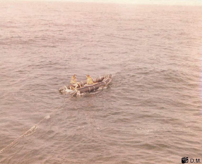 Exercice un homme à la mer ! Le zodiac s'éloigne avec une aussière.