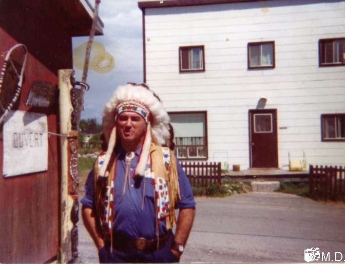 Visite d'un village Huron près de QUEBEC. Le Chef MAX GROS LOUIS avec sa coiffe de cérémonie