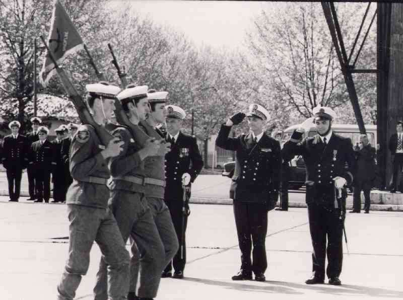 De g. à d. Stagiaires ? - ? - ? - Contre Amiral LE BRETON OLIVEAU - Contre Amiral FREMY - Lieutenant de Vaisseau MICHEA -