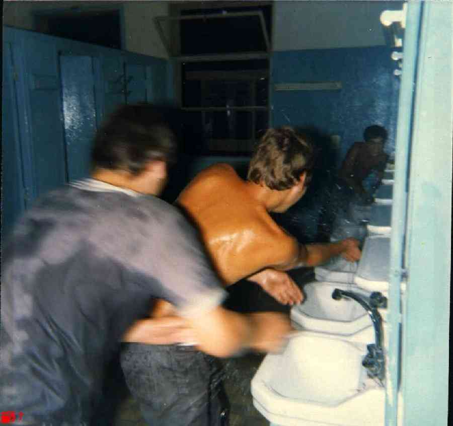 Eté 1975. Salle de bain de la base vie à terre. Bataille d'eau à 1 h du matin ...