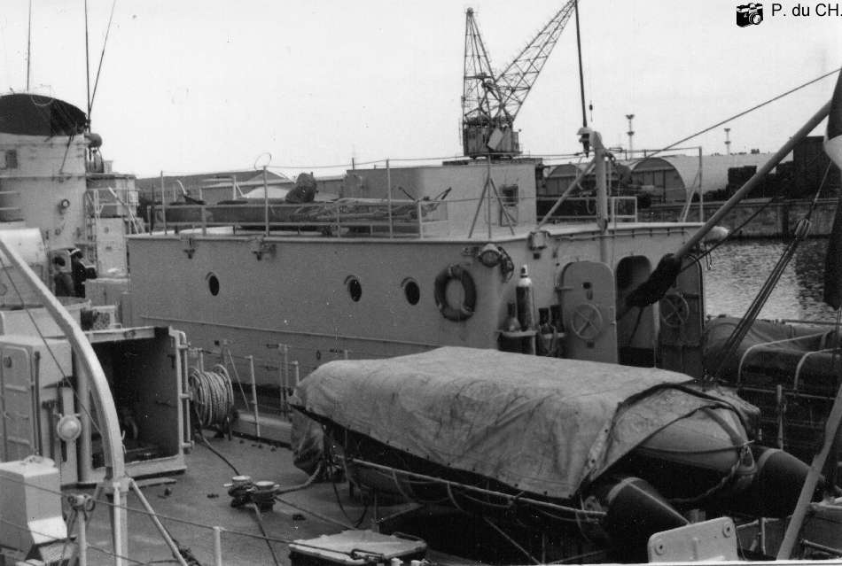 16 mai 1976. escale à Bruxelles. L' infirmerie du FRINGANT. Au premier plan le Zodiac de L' ENJOUE ( P 647 ).