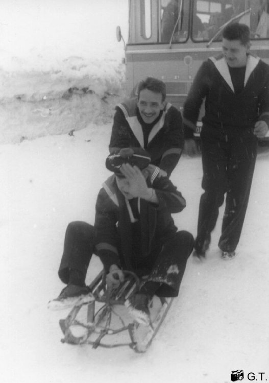 Les lugeurs. Assis le QM1 DSM (?) ? - puis QM1 élec ? - et le QM2 méca ?