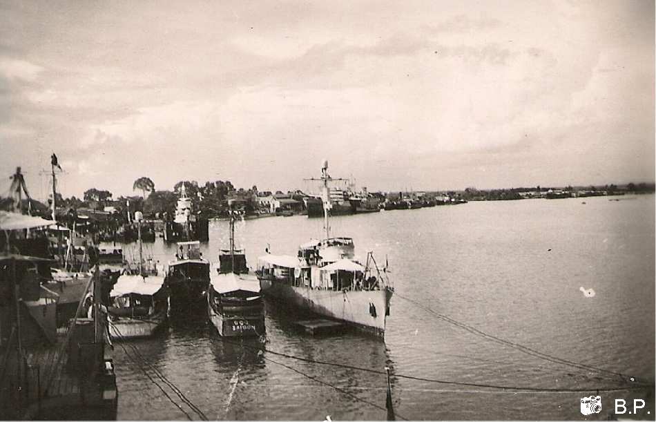 Après une période de purgatoire au 5ème dépôt des équipages de la Flotte de Toulon (surnommé le 5ème stalag par la plupart de ses pensionnaires!!), mes camarades détecteurs qui avaient comme moi, fait le cours à Porquerolles, nous sommes retrouvés à Marseille. Nous devions embarquer sur le paquebot " La Marseillaise " à destination de Saïgon!! Ce superbe navire ne mit que dix huit jours pour faire le trajet, et en arrivant au port de commerce, j'ai eu la joie de pouvoir embrasser mon frère aîné, Fernand, qui m'attendait sur le quai! Mon second frère, Jean, était quant à lui à Réam au Cambodge, depuis quelques mois déjà. Nous étions trois frères et tous les trois dans la Marine en Indochine en même temps ! Tous mes camarades venus en même temps que moi furent dispatchés sur les différents bateaux. Je fus désigné pour le patrouilleur côtier " HUE ", où je suis arrivé vers les trois ou quatre heures de l'après-midi. Ils étaient trois navires, tout blanc, sans armement, pas le moindre petit canon à l'horizon! Le " HUE ", le " LUANG PRABANG " et le " PONM PENH ". En cinq minutes on avait fait le tour des trois grandes capitales de l'Indochine française. Ils étaient blancs, parce que le plus gros travail des équipages français avait été de les délivrés de la gangue de produits utilisés pour mettre ces navires sous cocon! Ils avaient en suite remis les machines en état de marche. Les machines de ces PC avaient un nom que je n'ai jamais oublié: PAKSMAN-RICARDO. Cela sonnait bien, et moi qui ne connaissait rien à la mécanique, la seule vue de ces machines m'a rassuré! En ce qui concerne la peinture grise dont ils seront revêtus, il va sans dire que c'était l'équipage au complet qui s'en occupera! Pendant quelques semaines, on ne voyait que des moques de peinture et des pinceaux de toutes tailles dans les mains de " barbouilleurs " suant et transpirant (31 ou 32° aux alentours d midi!).La seule note gaie dans ce tableau étant le " rouge pont ". Mais la coque me direz vous? Pas de problème, dans l'arsenal, il y a la grande cale de radoub! En fin d'après-midi, les trois PC se retrouvèrent dans ce grand bassin où s'affairaient une armée de coolies qui affalaient des madriers qu'ils maintenaient entre le quai et la coque du bateau, afin d'éviter qu'il se pose de travers sur les tins qui sont au fond de la cale. Bref, nous nous sommes bientôt retrouvés sur un bateau sans eau , prêt à recevoir un grand carénage et une couche supplémentaire de peinture grise ! L'armement allait arrivé pendant ce grand carénage. Les ouvriers de l'arsenal confectionnèrent une barbette pour abriter notre affût de 40 mm, ainsi que des guides pour éviter que le canon ne tire sur la passerelle ou dans la mâture ! En suite à la passerelle, sur le spardeck, furent installées deux mitrailleuses lourdes de 20 mm et deux autres de 13,8 ou 12,7 mm sur l'arrière. Le plus gros morceau était sur a plage avant, un canon de 76 à mise à feu électrique. Je ne sais pourquoi, mais le LUANG PRABANG et le PNOM PENH furent équipés dès l'origine de ce fameux canon, alors que le HUE, parent pauvre, hérita un canon de 75 modifié ! Entendez par modifié qu'il n'avait plus les roues qui avaient fait sa gloire en 1914 ! Il était posé sur un affût qui lui permettait de pivoter. Il n'avait qu'un seul tireur en site et en hauteur. Celui-ci avait une œillère qui lui permettait de viser et un immense guidon (genre Harley-Davidson) avec une poignée de frein qu'il fallait serrer pour faire feu. Notre canonnier était un petit gars qui ne devait pas peser plus de 60 kilos, et de le voir tirer était un vrai bonheur ! Ce canon avait un recul de 70 cm, et il ne fallait pas rester derrière quand le coup partait ! Un jour, le canonnier, désireux de graisser son canon, commençât à dévisser des parties de son arme et bien qu'il suivait les instructions sur un manuel, le canon et la culasse sont tombés d'un seul bloc dans la descente du poste avant ! Il nous a fallut une bonne heure et au moins à huit hommes pour remonter cet engin de malheur ! Et puis un jour, en fin de mission, un télégramme est arrivé, qui nous annonçait que notre canon de 76 à mise à feu électrique nous attendait à l'arsenal. Mais pour faciliter les choses, il fallait vider la soute de ses obus de 75 qui apparemment n'intéressaient plus grand monde ! C'est ainsi que notre 75 qui ne nous avait pas beaucoup servi, est devenu une pièce majeure du navire. Nous avons longé la côte du sud de la Cochinchine et tiré sur tout ce qui bougeait. L'équipage et probablement les officiers commençaient à en avoir assez d'entendre le son du canon ! mais la soute à munitions se vidait et il nous tardait de rentrer à Saïgon pour recevoir notre superbe canon dont nous avions été privés pendant trois ou quatre mois. Nous en avions marre et les quinze jours d'escale nous feraient le plus grand bien !…