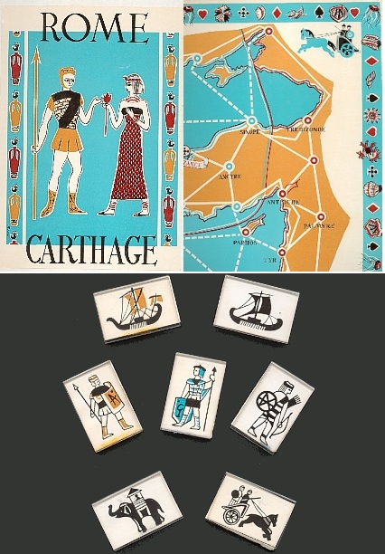 Une boîte en carton épais comme on en fait plus, un plateau de jeu représentant le bassin méditerranéen avec une belle mer toute bleue et quatre empires : Alexandrie, Byzance, Carthage et Rome. Ces empires sont constitués de cités reliées entre elles par des routes terrestres et maritimes. A quatre joueurs, on joue en équipe : Rome et Alexandrie contre Carthage et Byzance. Au début de la partie, chaque empire dispose de sept unités :