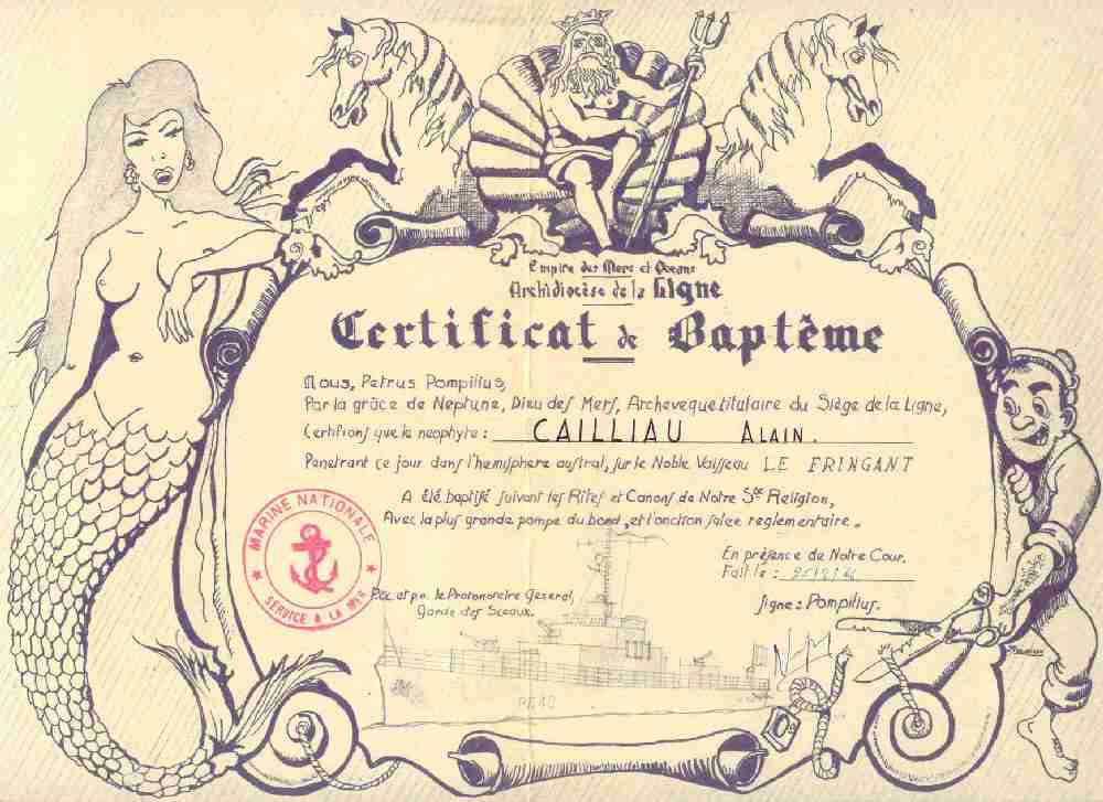 . 1966. Certificat de Baptême pour le passage de la ligne. Création JM. PERCHERON. .