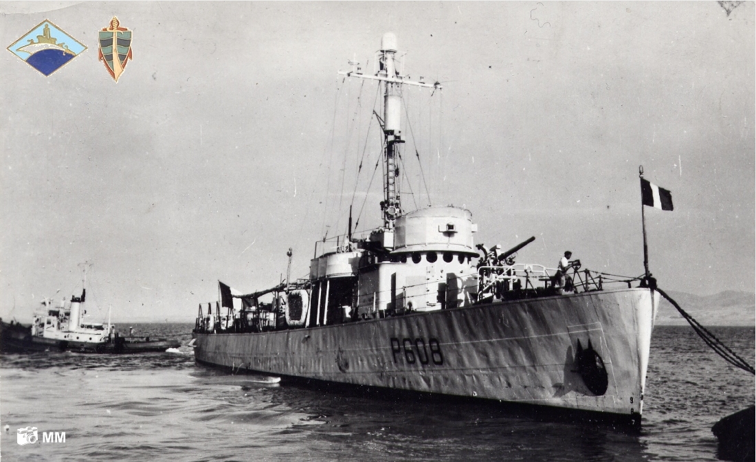 L'escorteur côtier CIMETERRE qui participa à l'arraisonnement de l'ATHOS. Sur coffre à Bizerte (Tunisie) le 29 juillet 1952.