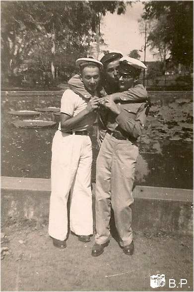 Après une période de purgatoire au 5ème dépôt des équipages de la Flotte de Toulon (surnommé le 5ème stalag par la plupart de ses pensionnaires!!), mes camarades détecteurs qui avaient comme moi, fait le cours à Porquerolles, nous sommes retrouvés à Marseille. Nous devions embarquer sur le paquebot " La Marseillaise " à destination de Saïgon!! Ce superbe navire ne mit que dix huit jours pour faire le trajet, et en arrivant au port de commerce, j'ai eu la joie de pouvoir embrasser mon frère aîné, Fernand, qui m'attendait sur le quai! Mon second frère, Jean, était quant à lui à Réam au Cambodge, depuis quelques mois déjà. Nous étions trois frères et tous les trois dans la Marine en Indochine en même temps ! Tous mes camarades venus en même temps que moi furent dispatchés sur les différents bateaux. Je fus désigné pour le patrouilleur côtier " HUE ", où je suis arrivé vers les trois ou quatre heures de l'après-midi. Ils étaient trois navires, tout blanc, sans armement, pas le moindre petit canon à l'horizon! Le " HUE ", le " LUANG PRABANG " et le " PONM PENH ". En cinq minutes on avait fait le tour des trois grandes capitales de l'Indochine française. Ils étaient blancs, parce que le plus gros travail des équipages français avait été de les délivrés de la gangue de produits utilisés pour mettre ces navires sous cocon! Ils avaient en suite remis les machines en état de marche. Les machines de ces PC avaient un nom que je n'ai jamais oublié: PAKSMAN-RICARDO. Cela sonnait bien, et moi qui ne connaissait rien à la mécanique, la seule vue de ces machines m'a rassuré! En ce qui concerne la peinture grise dont ils seront revêtus, il va sans dire que c'était l'équipage au complet qui s'en occupera! Pendant quelques semaines, on ne voyait que des moques de peinture et des pinceaux de toutes tailles dans les mains de " barbouilleurs " suant et transpirant (31 ou 32° aux alentours d midi!).La seule note gaie dans ce tableau étant le " rouge pont ". Mais la coque me direz vous? Pas de problème, dans l'arsenal, il y a la grande cale de radoub! En fin d'après-midi, les trois PC se retrouvèrent dans ce grand bassin où s'affairaient une armée de coolies qui affalaient des madriers qu'ils maintenaient entre le quai et la coque du bateau, afin d'éviter qu'il se pose de travers sur les tins qui sont au fond de la cale. Bref, nous nous sommes bientôt retrouvés sur un bateau sans eau , prêt à recevoir un grand carénage et une couche supplémentaire de peinture grise ! L'armement allait arrivé pendant ce grand carénage. Les ouvriers de l'arsenal confectionnèrent une barbette pour abriter notre affût de 40 mm, ainsi que des guides pour éviter que le canon ne tire sur la passerelle ou dans la mâture ! En suite à la passerelle, sur le spardeck, furent installées deux mitrailleuses lourdes de 20 mm et deux autres de 13,8 ou 12,7 mm sur l'arrière. Le plus gros morceau était sur a plage avant, un canon de 76 à mise à feu électrique. Je ne sais pourquoi, mais le LUANG PRABANG et le PNOM PENH furent équipés dès l'origine de ce fameux canon, alors que le HUE, parent pauvre, hérita un canon de 75 modifié ! Entendez par modifié qu'il n'avait plus les roues qui avaient fait sa gloire en 1914 ! Il était posé sur un affût qui lui permettait de pivoter. Il n'avait qu'un seul tireur en site et en hauteur. Celui-ci avait une œillère qui lui permettait de viser et un immense guidon (genre Harley-Davidson) avec une poignée de frein qu'il fallait serrer pour faire feu. Notre canonnier était un petit gars qui ne devait pas peser plus de 60 kilos, et de le voir tirer était un vrai bonheur ! Ce canon avait un recul de 70 cm, et il ne fallait pas rester derrière quand le coup partait ! Un jour, le canonnier, désireux de graisser son canon, commençât à dévisser des parties de son arme et bien qu'il suivait les instructions sur un manuel, le canon et la culasse sont tombés d'un seul bloc dans la descente du poste avant ! Il nous a fallut une bonne heure et au moins à huit hommes pour remonter cet engin de malheur ! Et puis un jour, en fin de mission, un télégramme est arrivé, qui nous annonçait que notre canon de 76 à mise à feu électrique nous attendait à l'arsenal. Mais pour faciliter les choses, il fallait vider la soute de ses obus de 75 qui apparemment n'intéressaient plus grand monde ! C'est ainsi que notre 75 qui ne nous avait pas beaucoup servi, est devenu une pièce majeure du navire. Nous avons longé la côte du sud de la Cochinchine et tiré sur tout ce qui bougeait. L'équipage et probablement les officiers commençaient à en avoir assez d'entendre le son du canon ! mais la soute à munitions se vidait et il nous tardait de rentrer à Saïgon pour recevoir notre superbe canon dont nous avions été privés pendant trois ou quatre mois. Nous en avions marre et les quinze jours d'escale nous feraient le plus grand bien !…