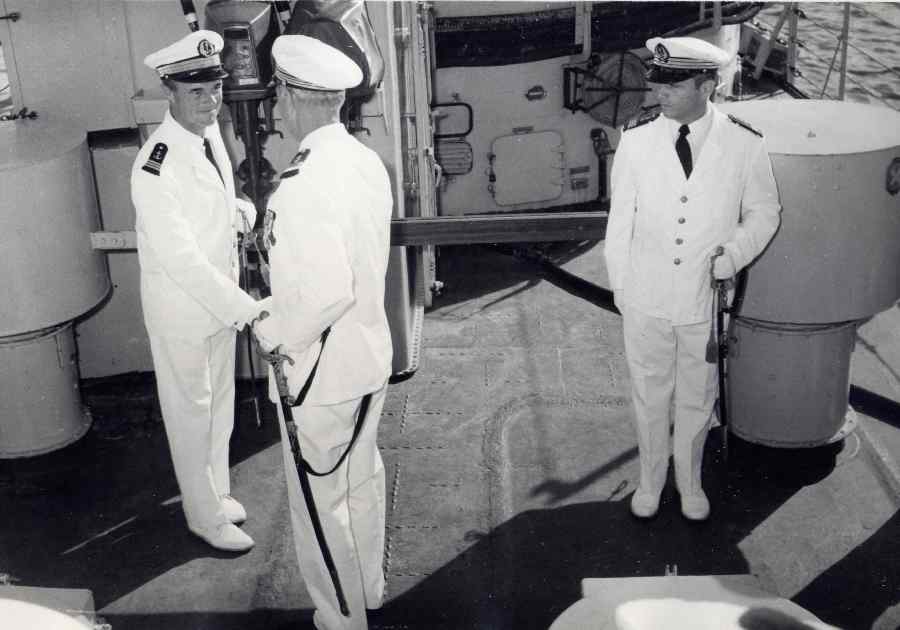 . Le CV JACOLOT félicite le nouveau Commandant du FRINGANT.