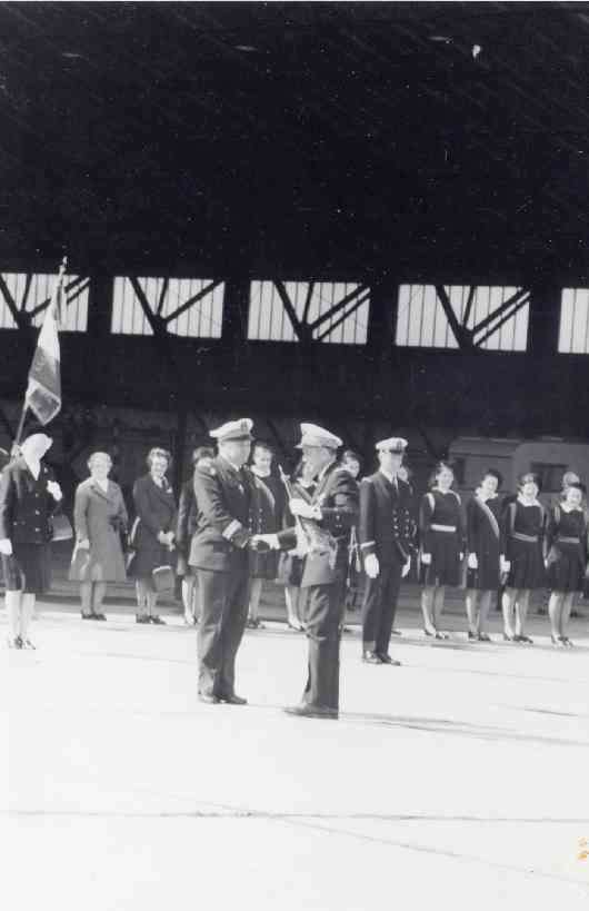 L'Officier en Chef des Equipages Guy VOURCH remet le fanion au Contre Amiral LE BRETON OLIVEAU.